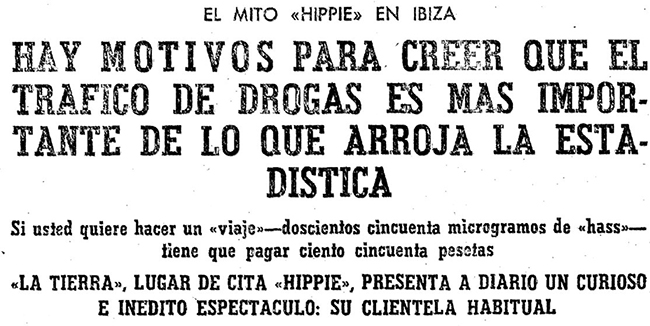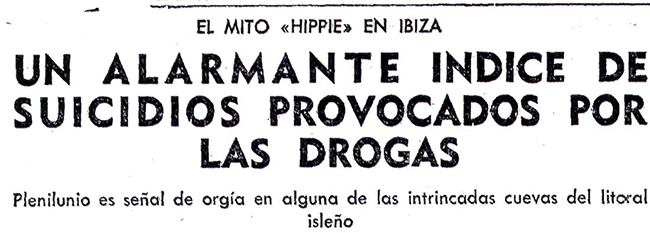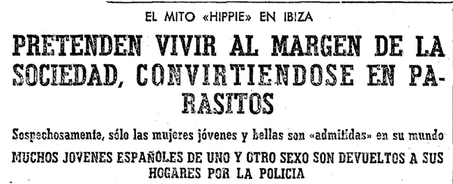 • “Ibiza hippy (7). Urge desenmascarar a los verdaderos responsables del tráfico de drogas. Hay melenudos que se hacen pasar por hippies con la sola intención del ligue” (Pueblo, 07.10.1969).