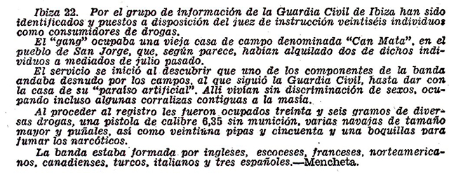 Unos meses antes, en diciembre del pasado año, la Brigada Especial de Estupefacientes logró desarticular en Madrid un grupo formado por elementos subversivos universitarios, afiliados al Partido Comunista, dedicados a iniciar a sus jóvenes compañeros en el uso de las drogas. Se les ocupó, como recordarán ustedes, gran cantidad de distintos productos, que ocultaban en el piso que habían habilitado para sus fines. En Ibiza, como ramificación de este grupo, se detuvo a un joven norteamericano, Alex D.R., quien desde su puesto estratégico de “barman” en uno de los locales “discotecas” de la capital ibicenca se dedicaba a la distribución entre la juventud de las valiosas pastillas de LSD-25.