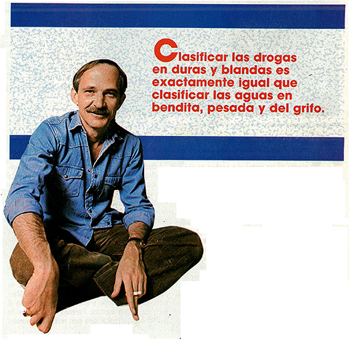 —Eso fue muy divertido. El trabajo tenía mucha bibliografía y notas a pie de página. En «Revista de Occidente» vieron el lado Huxley, el lado William Blake, que es un precedente muy importante. Y en aquella época todavía no había llegado el primer latigazo de la reacción norteamericana. De hecho, por esas fechas, el LSD no era aún ilegal. Recuerda que por entonces Ken Kesey y los Merry Pranksters andaban por Estados Unidos, de costa a costa, en un autobús viajando en ácido. Así que en el sesenta y tantos en España aquello no soltaba el tufillo a droga que tendría después.