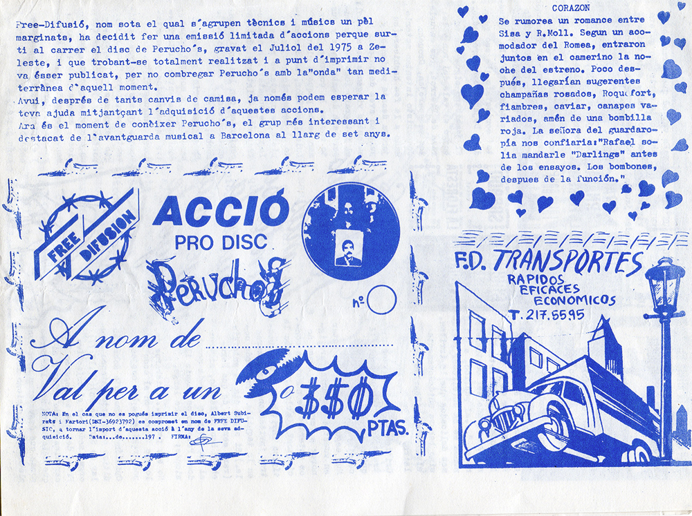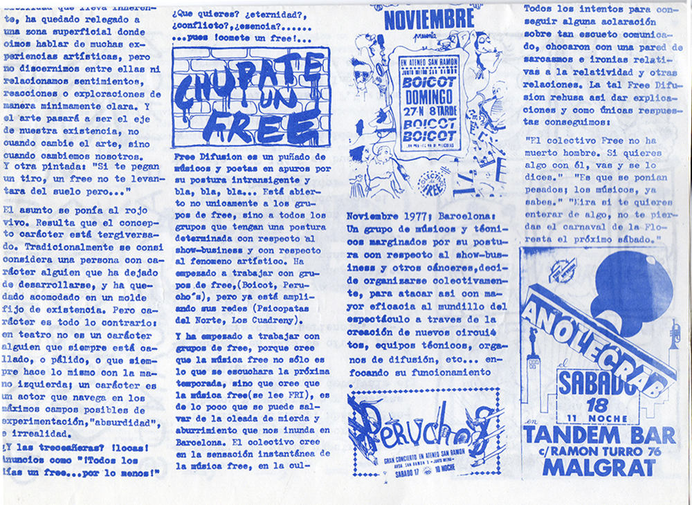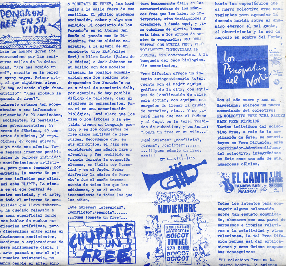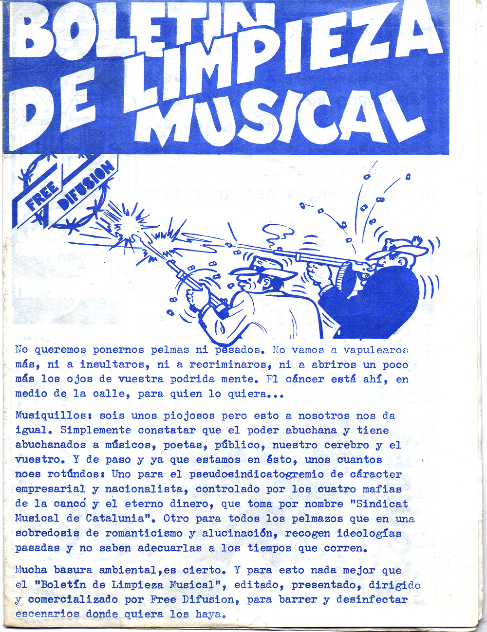 ….Pau Riba se presenta con Perucho’s / finales 77 o principios 78. desde el Boletín de Limpieza Musical, que edita el colectivo Free Difusión,.. El libro se complementa con diferentes ilustraciones de los pasquines publicitarios de Free Difusion y del Boletín de limpieza musical en la… con antecedentes en el ‘Boletín de Limpieza Musical’ de Perucho’s y ‘Elperiódicodenadamasunahoja’ de Macromassa– y recopilatorios como “Obtención de … amb la seva impagable publicació Boletín de Limpieza Musical, eren la seva resposta no només a un moment històric sinó a un entorn -fins i … i tambè sortien per retallar-los en algun Boletín de Limpieza Musical. total, que estem parlant de 1976, 77 o 78, així que encara faltava temps … en sus épocas como “free” un nexo común al Colectivo Free Difusion que organizaba conciertos en la Sala Orquídea y editaba el Boletín de Limpieza Musical. published the Boletín de Limpieza Musical. More relaxed, but no less disquieting, was Jaume Cuadreny, an electric psychoballad singer, whose performances … promotoras como Free-Difusion, tomando locales como el Saló Diana, o publicando el impagable Boletín de Limpieza Musical, que eran su respuesta no sólo… publicacions marginals, Accions, Boletín de Limpieza Musical, 3coco, Fuera de Banda, Trotón, i revistes de còmics Bésame Mucho, Cairo, …