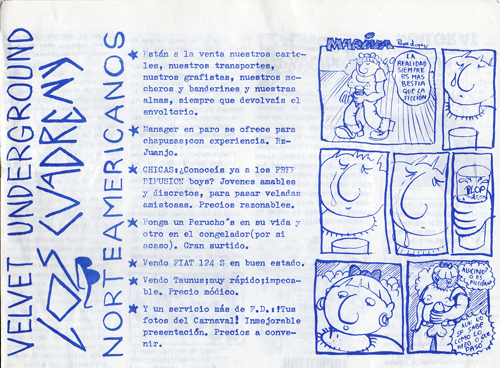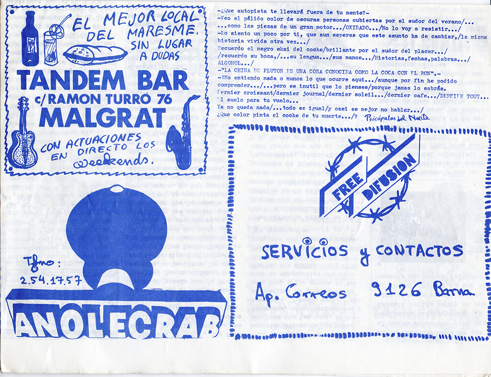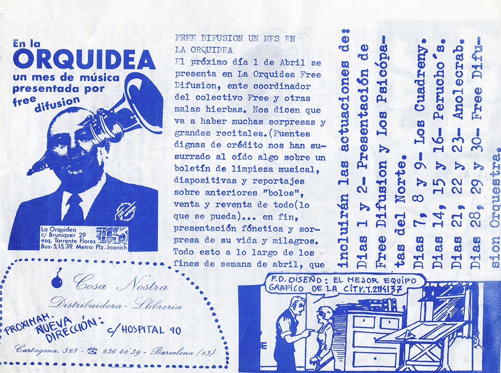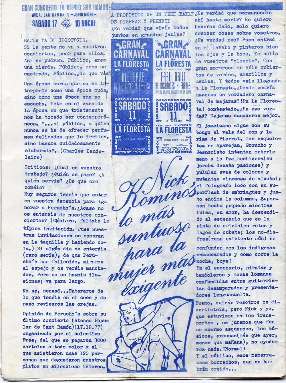 ….Pau Riba se presenta con Perucho’s / finales 77 o principios 78. desde el Boletín de Limpieza Musical, que edita el colectivo Free Difusión,.. El libro se complementa con diferentes ilustraciones de los pasquines publicitarios de Free Difusion y del Boletín de limpieza musical en la… con antecedentes en el ‘Boletín de Limpieza Musical’ de Perucho’s y ‘Elperiódicodenadamasunahoja’ de Macromassa– y recopilatorios como “Obtención de … amb la seva impagable publicació Boletín de Limpieza Musical, eren la seva resposta no només a un moment històric sinó a un entorn -fins i … i tambè sortien per retallar-los en algun Boletín de Limpieza Musical. total, que estem parlant de 1976, 77 o 78, així que encara faltava temps … en sus épocas como “free” un nexo común al Colectivo Free Difusion que organizaba conciertos en la Sala Orquídea y editaba el Boletín de Limpieza Musical. published the Boletín de Limpieza Musical. More relaxed, but no less disquieting, was Jaume Cuadreny, an electric psychoballad singer, whose performances … promotoras como Free-Difusion, tomando locales como el Saló Diana, o publicando el impagable Boletín de Limpieza Musical, que eran su respuesta no sólo… publicacions marginals, Accions, Boletín de Limpieza Musical, 3coco, Fuera de Banda, Trotón, i revistes de còmics Bésame Mucho, Cairo, …
