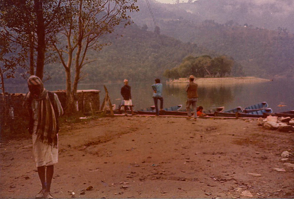 En arribar, el Toti es va quedar a Pokhara i el Krupa (ara, Harida) i jo vam baixar fins al llac i ens vam allotjar en una casa particular on llogaven quartets que eren al pati de darrere, entre plataners, vegetació exòtica, enormes flors i papallones gegants. Un petit tancat de canyes amb un bidó rovellat, ple d’aigua, era el lavabo. Hi havia tres o quatre habitacions petites de fang cru, encara una mica humit. Era com viure dins d’una gerra. Un dels nens d’aquella família cada matí es feia petar els ossos de tot el cos. Va al·lucinar amb la meva caixa de llapis de colors. Vam passar uns dies a la vora del llac passejant per caminets i carreteres, prenent l’ombra sota arbres mil·lenaris, comprant cacauets bruts de cendra, plàtans enormes i llavors de meló a les paradetes, que no eren res més que mocadors a terra amb la mercaderia. Vorejàvem el camí contemplant el fons de muntanyes diamantines, fumant xíloms a barraques de te amb barquers, entre hippies i viatgers. Vam conèixer el Govinda, un xaval d’allà, moreno i amb bigoti, que es va convertir en guia, assessor, proveïdor de maria i haixix i amic.