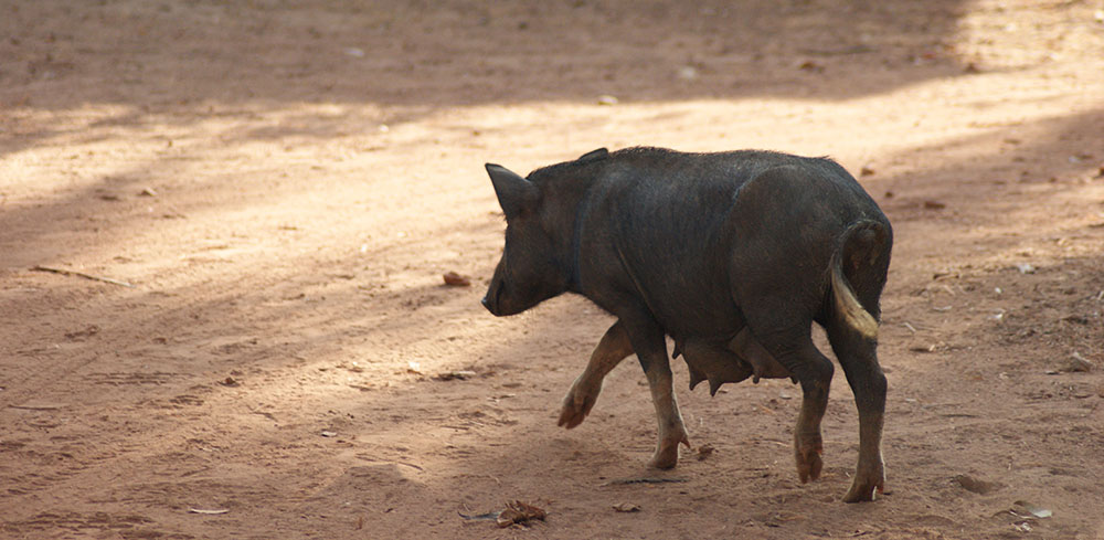 Una vegada vaig anar a un banc, em sembla que a Mapusa, i vaig demanar-los d’anar al wàter. Era d’obra. Un plat amb els dos llocs per als peus. Quin luxe, vaig pensar. Un cop ajupit i entrant en matèria vaig sentir, a pocs pams del cul, els grinyols i esbufegades que sentia cada matí a la platja. El forat era un tobogan pel qual vaig veure el morro de dos o tres porcs competint per menjar-s’ho, calentet, tal com queia: el progrés.