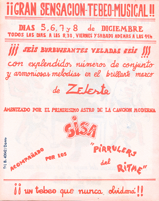 Las luces de Zeleste se apagaron y apareció un curioso cameraman –Picarol, otro personaje interesante en el seno del underground barcelonés-, que puso en marcha un aparato de “Cine-Nic” (¿quién no había tenido un proyector de “Cine-Nic” en su infancia?), proyectando ilustraciones diversas: desde las canciones de Santi Sisa hasta anuncios de sus pósters y publicaciones. Entretanto, otro curioso personaje (“Popeye”) vendía tebeos, disfrazado como “el fill del mestre” (bata azul a rayas y manchas de tinta, grandes orejotas). Tras la proyección, salió Sisa.