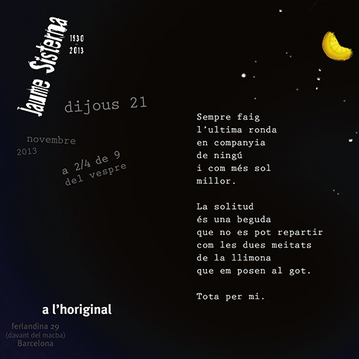 Dijous 21 a 2 quarts de 9 hi haurà un homenatge al poeta Jaume Sisterna a L’ORIGINAL C/. Ferlandina 29 (davant del MACBA) Barcelona 08001