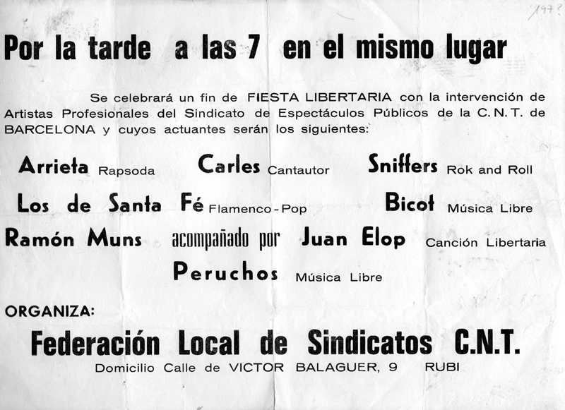 Amb la participació del rapsoda Arrieta, Carles, Ramón Muns i els grups musica Sniffers, Los de Santa Fé, Bicot i final de festa amb Perucho’s, integrats aquell any en el Sindicat d’espectacles públics de la CNT.