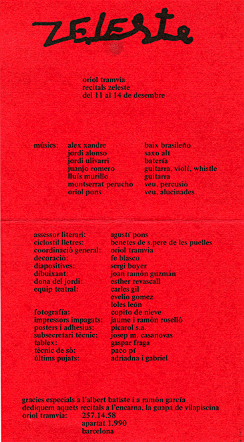 2Jo si recordo, va ser una festa. Al final del concert l’Oriol Tramvia es va posar a ballar a sobre de la barra del Zeleste, en fi una autentica disbauxa com diriem ara. Ell era conscient que havia de deixar una bona impressió al públic de Zeleste, i ho va aconseguir. Per cert, el meu germà Juanjo Romero formava part de la banda. Mes tard va sortir el disc “Bèstia!“gravat en viu.