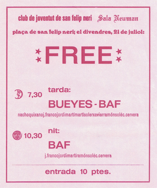 8Hola Ramon, no tindries pas el cartell ( o flyer) de l’actuació de Baf al Vivacce de Badalona , potser el 72, 73. Hi vaig assistir i recordo algo del concert i… com em banyava vestit al mar, osigui que era istiu, o no.
