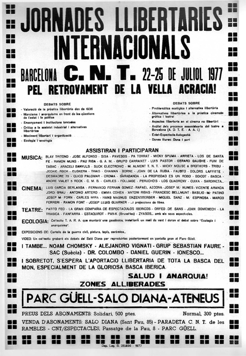Heus aquí la peli de les Jornades Llibertàries de Barcelona al Parc Güell que va rodar Johnny Estil·les el 1977. Acompanyen la peli dues cançons del Johnny Estil·les : Terra, terra i Abduïts. És una pel·lícula que no posa el focus en els debats ni en les icones del moment sinó que vol i aconsegueix retratar l’ambient que hi havia al Park Güell aquell estiu.