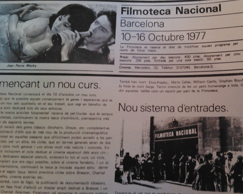 NV: Era exactamente igual. Todos los ciclos se decidían entre las dos sedes y se programaban en las dos ciudades, no había ninguna diferencia. Los invitados venían siempre a las dos ciudades. Los dossiers informativos que se empezaron a editar esos años, servían para las dos Filmotecas y casi todos se hacían en Barcelona.