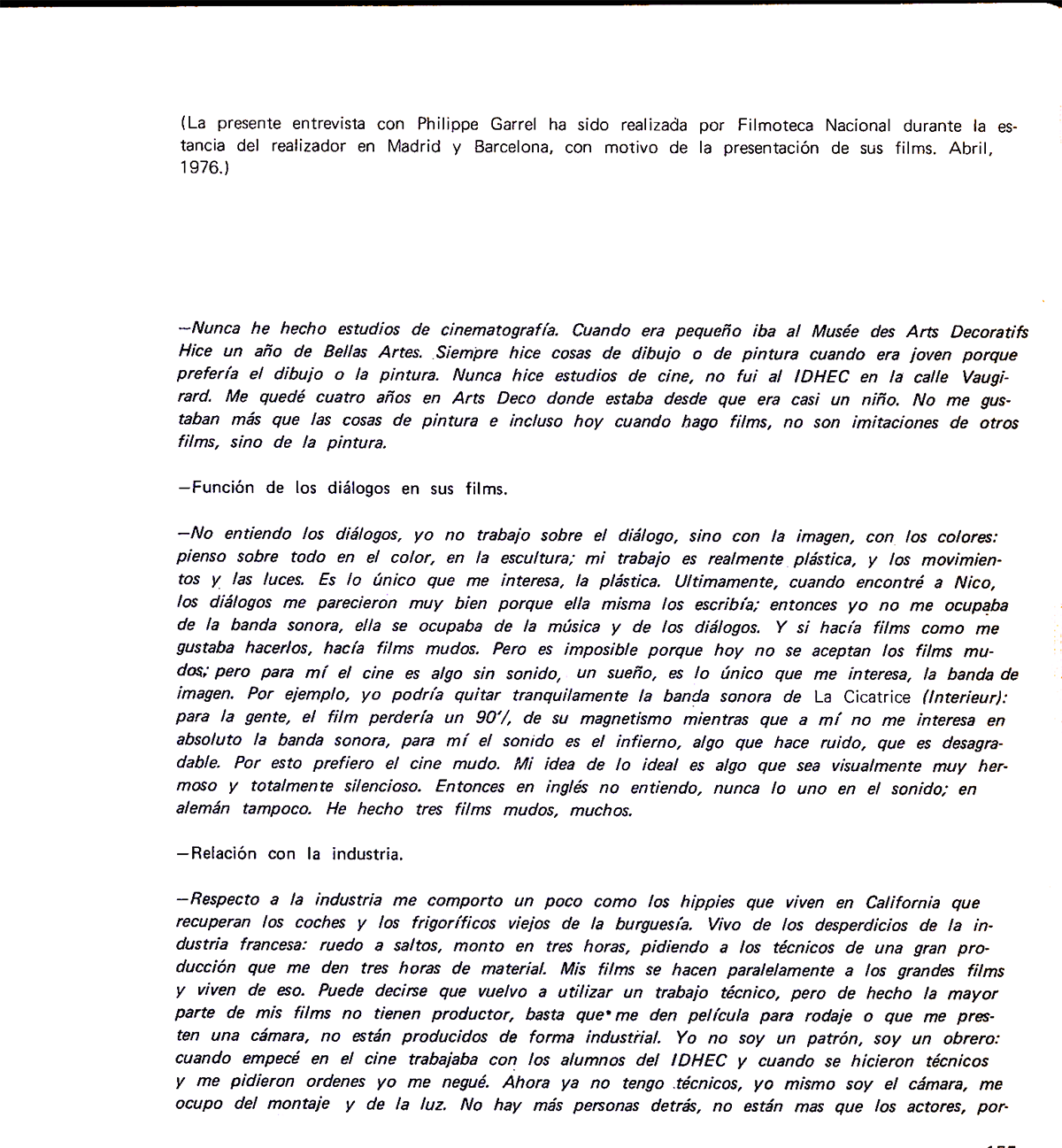 Garrel vino a Barcelona en abril del 76. Su cine me entusiasmó. Llegó acompañado de la mítica Nico, que acabó quedándose un tiempo en La Floresta Chelsea Girl a Barcelona. Nuria me facilita este fragmento de la entrevista que le hicieron a Garrel.