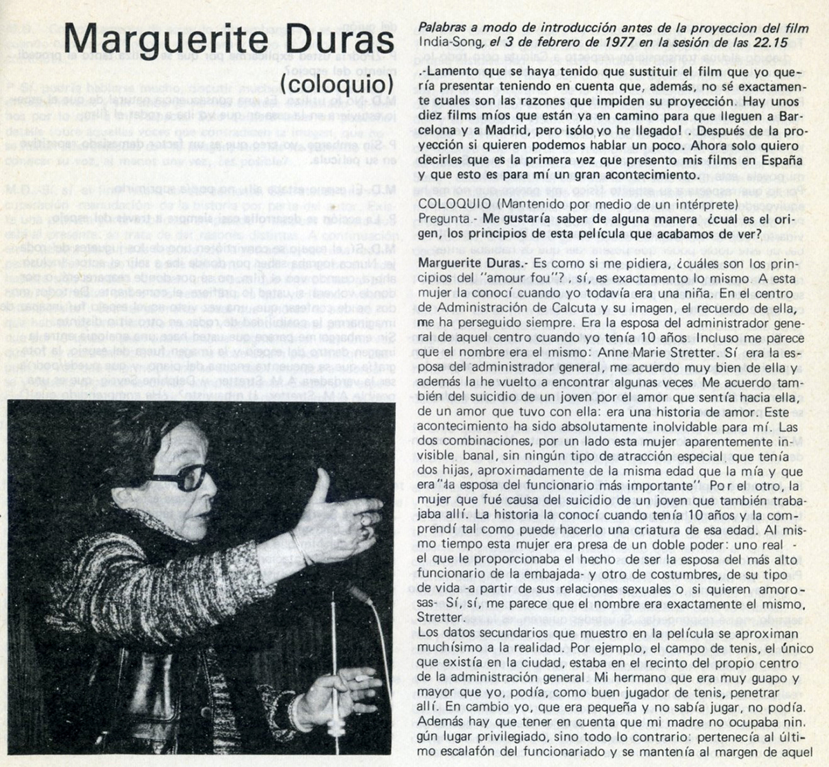 También recuerdo la enorme impresión que me dejó Marguerite Duras cuando vino a presentar el ciclo sobre su cine (febrero 1977). La película que acabó proyectándose (“India Song”) no era la programada, como ella misma dice en la entrevista aquí incluida, curiosamente llegó antes ella que sus películas. En cualquier caso yo no había visto “India Song” y el magnetismo de la Duras en el escenario hizo muy memorable aquella noche.