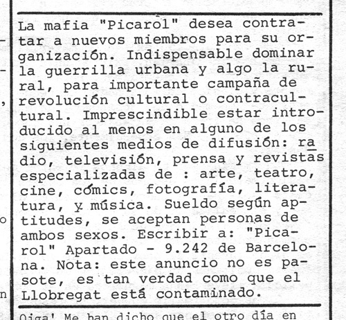 Vaig tenir l’honor en aquells dies de 1975-7…de “treballar” per a la mafia d’en Picarol. Sempre vestit de negre , amb la seva barbeta de follet emprenyador, ell anava foten canya al poder establert amb el cap ben clar i sense aturador, era genial. No recordo beneficis economics, aixó si , recordo que en Pica era , es un dels més autentics personatges de la contracultura dels setanta. Ell va ser un dels primers que d’una manera totalment llibertaria i trencadora ha arribat fins avui sempre seguint el camí de les seves idees. Aquest anunci , com tantes altres accions que va dur a terme , anaven crean una llegenda que crec que te que donar algun dia per unes bones memories o crònica d’algún cadell d’escriptor. Andavant Picarol!