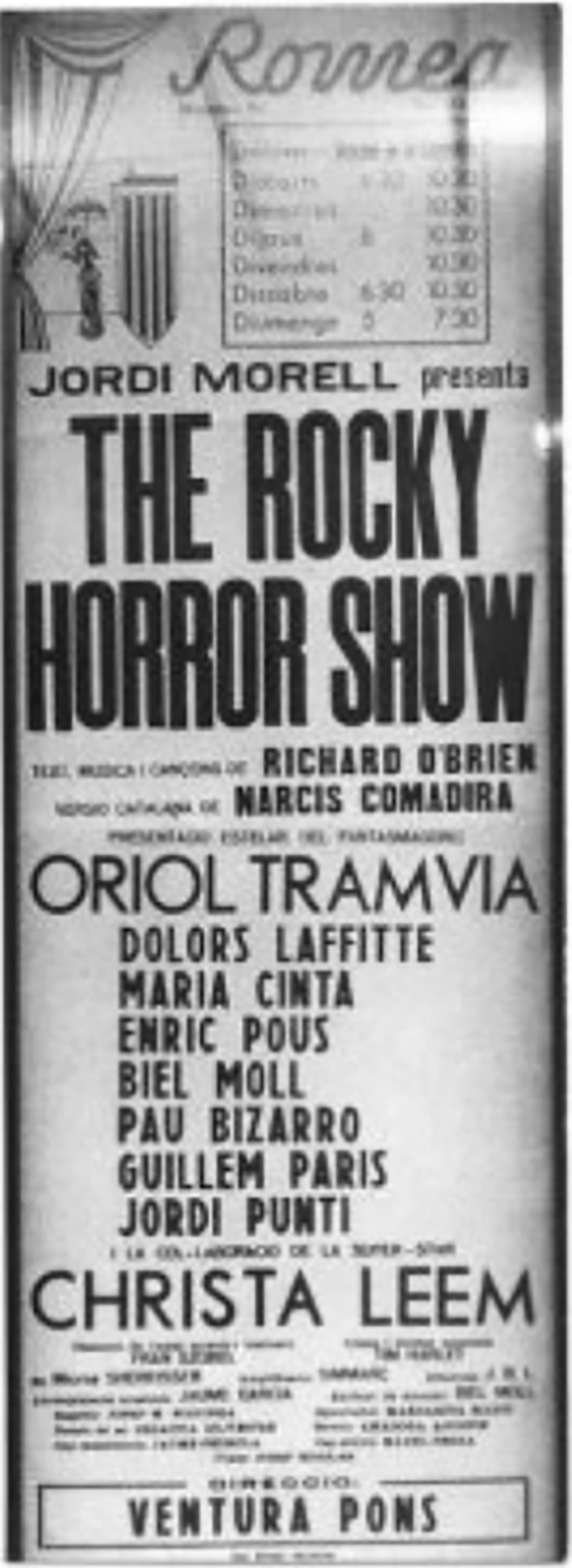 Una versió en català del musical dirigida per Ventura Pons i produït per Jordi Morell, amb el lema l’Espectacle més desmadrat del segle va ser estrenada el 4 de març de 1977 al Teatre Romea de Barcelona. El llibret va ser traduït per Narcís Comadira, que va canviar els noms dels tres conductors, Frank-N-A més, Janet Weiss i Brad Majors. Els personatges es van re-anomenar, el Dr. Frank Esteve, Anna Prou Grossa i Ramon Poch. El repartiment va comptar amb Oriol Tramvia com Frank, Maria Cinta com “Anna”, Jordi Ponti com “Ramón”, Guillem París com Riff Raff, Christa Leem com magenta i l’Usherette, Dolors Laffite com Columbia, Enric Pous com Eddie / Dr Scott , Pau Bizarro com Rocky Horror i Biel Moll com el narrador.