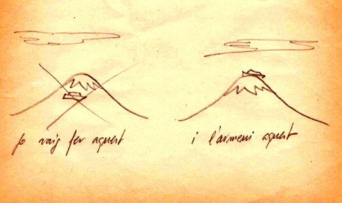 parar, dins d’una gran planura, tenia una sola gran muntanya, immensa, que tot ho domina. És la muntanya més muntanya que hagi vist mai, una mena de “Fuji” més gran i alt encara. Majestuosa, nevada, prohibida. Jo vaig fer aquest dibuix i li vaig ensenyar a un armeni i el va corregir.